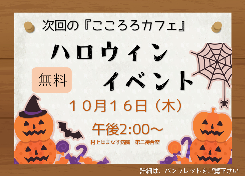 お知らせ HOME > お知らせ > 次回の『こころろカフェ』は10/16(木)です☕ 次回の『こころろカフェ』は10/16(木)です☕ 2025-10-08 お知らせ 次回のこころろカフェは「ハロウィンイベント🎃」です★ クイズやハロウィンにちなんだ工作など行う予定です🎃 イベント終了後に相談していただく時間もございます。 お誘いあわせの上、どうぞお気軽にご参加ください★★★ 10月16日(木)14:00開始(受け付け13:50~)1階 第2待合室 前後の記事へのリンク 前の記事 - 🏮はまなす祭り開催のお知らせ🏮