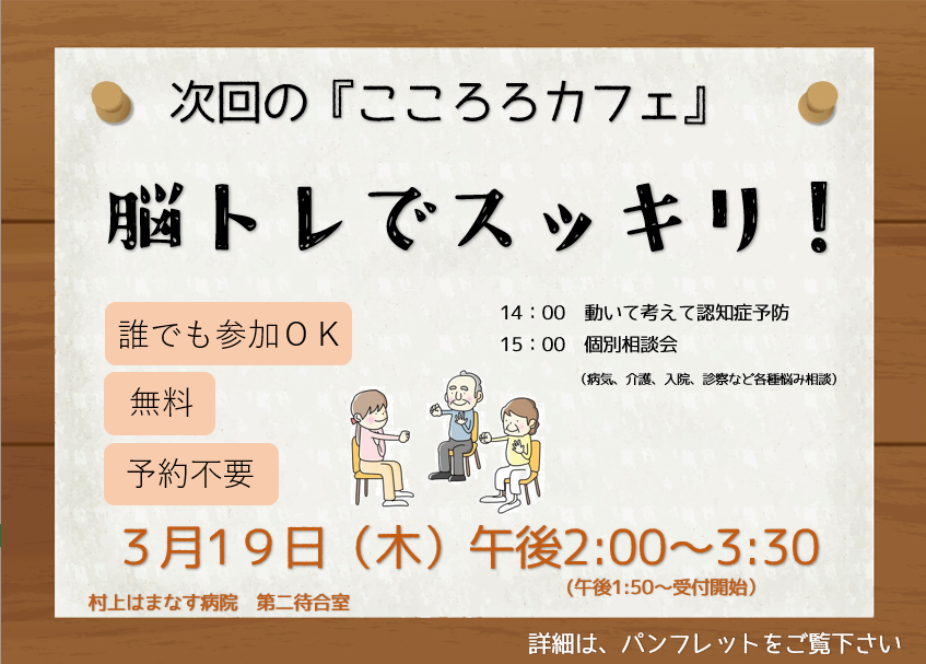 お知らせ HOME > お知らせ > 次回の『こころろカフェ』は3月19日(木)です☕ 次回の『こころろカフェ』は3月19日(木)です☕ 2026-03-11 お知らせ 重要なお知らせ 今月のテーマは「脳トレでスッキリ!」~動いて考えて認知症予防~がテーマです! 体と脳は密接に関係しています。体を動かしながら考えることで、認知症の予防が期待できますよ! 雪も溶けて、少しづつ春の陽気になってきましたので、ご近所様などお誘いあわせの上、お気軽においでください🌸 3月19日(木)14:00開始(受け付け13:50~)1階 はまなす病院内 第2待合室 前後の記事へのリンク 前の記事 - 次回の『こころろカフェ』は2月19日(木)です☕